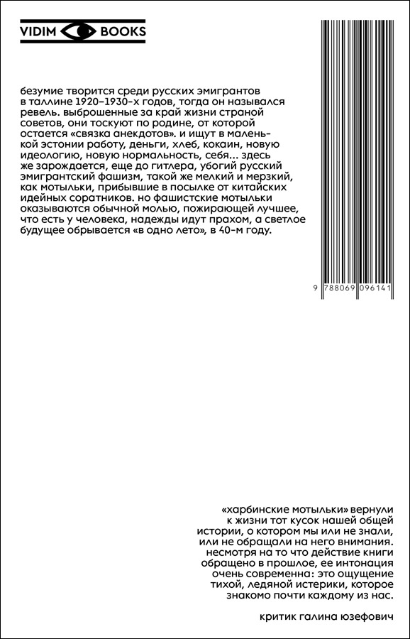 Безумие творится среди русских эмигрантов в Таллине 1920–1930-х годов, тогда он назывался Ревель. Выброшенные за край жизни Страной Советов, они тоскуют по родине, от которой остается «связка анекдотов». И ищут в маленькой Эстонии работу, деньги, хлеб, кокаин, новую идеологию, новую нормальность, себя... Здесь же зарождается, еще до Гитлера, убогий русский эмигрантский фашизм, такой же мелкий и мерзкий, как мотыльки, прибывшие в посылке от китайских идейных соратников. Но фашистские мотыльки оказываются обычной молью, пожирающей лучшее, что есть у человека, надежды идут прахом, а светлое будущее обрывается «в одно лето», в 40-м году.