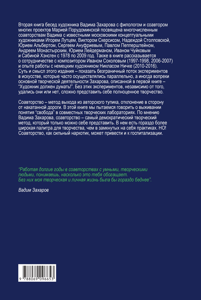 Вторая книга бесед художника Вадима Захарова с филологом и соавтором многих проектов Марией Порудоминской посвящена многочисленным соавторствам Вадима с известными московскими концептуальными художниками Игорем Лутцем, Виктором Скерсисом, Надеждой Столповской, Юрием Альбертом, и др. с 1978 по 2009 год. Также в книге рассказывается о сотрудничестве с композитором Иваном Соколовым (1997-1998, 2006-2007) и опыте работы с немецким художником Никласом Ничке (2010-2016).