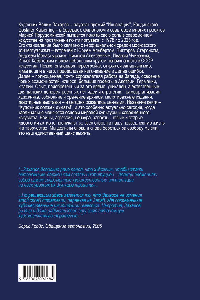 Опыт, приобретенный за это время, уникален, а естественные для далеких доперестроечных лет идеи и стратегии — самоорганизация художника, собирание и хранение архивов, малотиражные издания, квартирные выставки — и сегодня оказались ценными. Название книги — «Художник должен думать!», и это особенно актуально сегодня, когда кардинально меняются основы мировой культуры и современного искусства. Войны, агрессия, цензура, запреты, новые и старые идеологии активно проникают со всех сторон в нашу повседневную жизнь и в творчество. Мы должны снова и снова бороться за свободу мысли, это наш единственный шанс выжить.